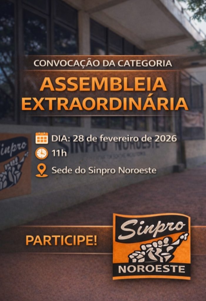 📢 O Sinpro Noroeste convoca toda a categoria de professoras e professores para Assembleia Extraordinária, a ser realizada no dia 28 de fevereiro de 2026, às 11 horas, na sede do Sinpro Noroeste.
